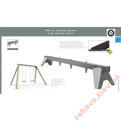 Дана балка використовується спеціально для підвішування двох дитячих гойдалок. У даному комплекті використовуються підвіси Premium, які виконані з дуже міцної оцинкованої сталі згідно з жорсткими вимогами до цих елементів.