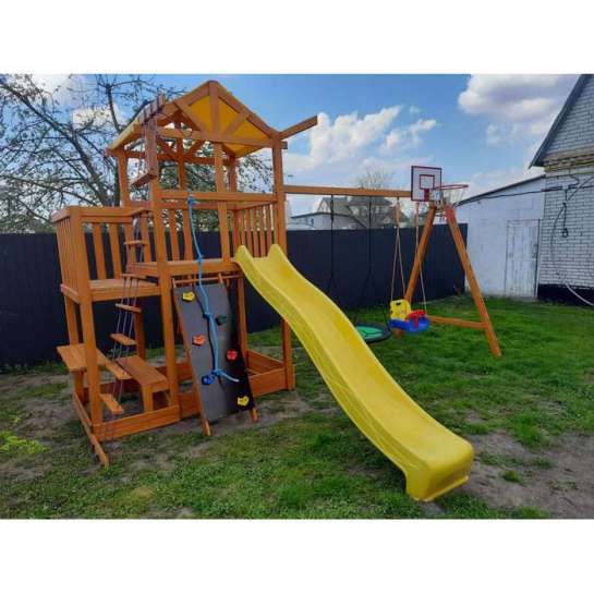 Додатково Вам пропонується укомплектувати площадку: баскетбольне кільца, круглі гойдалки Гніздо, гойдалки зі спинками, боксерську грушу, поручні на драбинку, пластикові ігрові бінокль, кермо, дитячий поштовий ящик.
