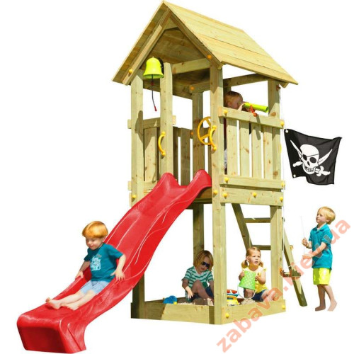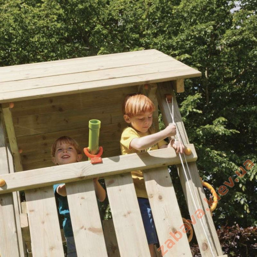 Дитячий ігровий будиночок з гіркою KIOSK пропонує відмінне співвідношення ціни та якості. Вона має дерев'яну конструкцію і може бути легко розширена за допомогою будь-яких інших модулів на ваш вибір представлених в нашому магазині.