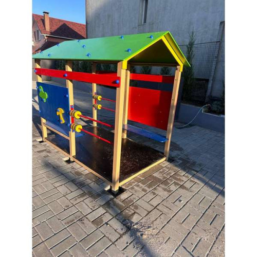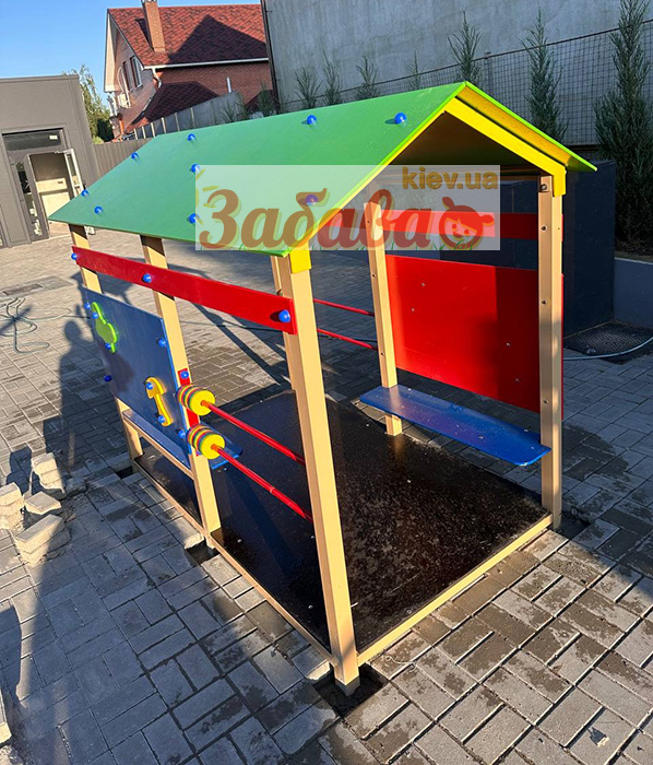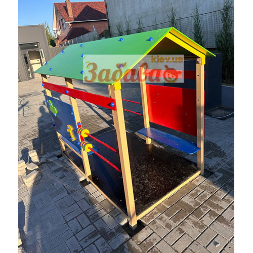 Ігровий будиночок зроблений повністю із фанери. У будиночка є лавки та рахівничка. В комплекті є підлога.