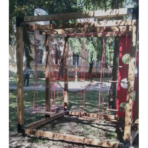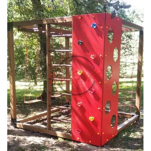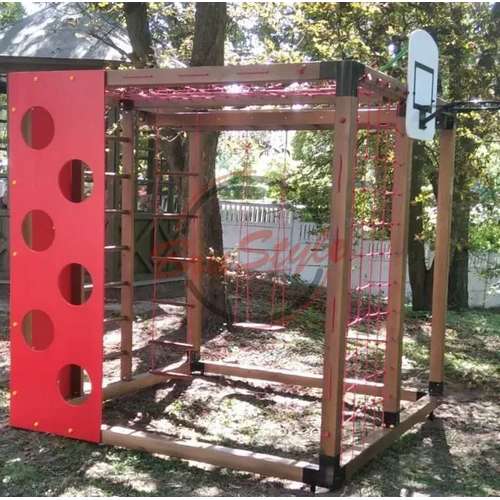 Стінка для лазання дозволяє дітям розвивати силу та координацію, а баскетбольне кільце стимулює їхні спортивні навички та точність кидків. Гойдалки та рукоход додають елементи веселощів та балансу, а шведська стінка допомагає розвивати м’язи та гнучкість. Канатна сітка додає елемент висоти та виклику для дітей, які люблять пригоди.