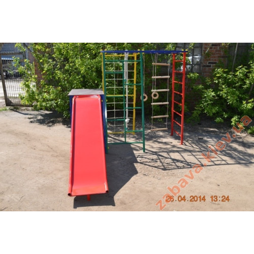 Параметри: весь комплекс - 170х280х200 см, висота рукохода 170 см, ширина рукохода 66 см, довжина рукохода 150 см, ширина між стійками внизу 130 см, висота майданчика перед гіркою 100 см, довжина та ширина майданчика 60*90 см 200*43 см.