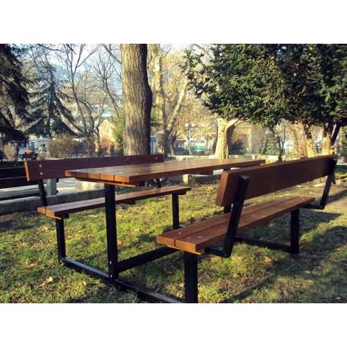 Комплект столу з лавками вироблено з міцної металевої конструкції та соснових дощок. Підходить для стаціонарної установки у парках, садах, дворових просторах, ресторанах на свіжому повітрі.