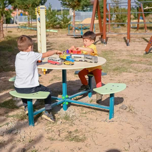 Елемент дитячого обладнання для дитячих майданчиків. Має 4 місця для сидіння. Тут діти зможуть зручно пограти в ляльки, розвиваючі ігри, або просто відпочити та поспілкуватися. Прекрасний варіант для доповнення дитячого майданчика. Столик розбірний, що дуже зручно у використанні.- Розмір - 1,5х1,5х1,02 м