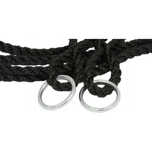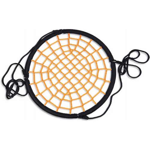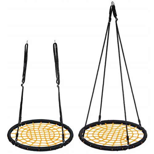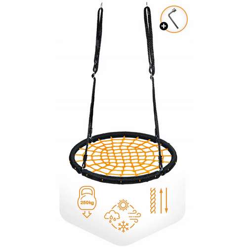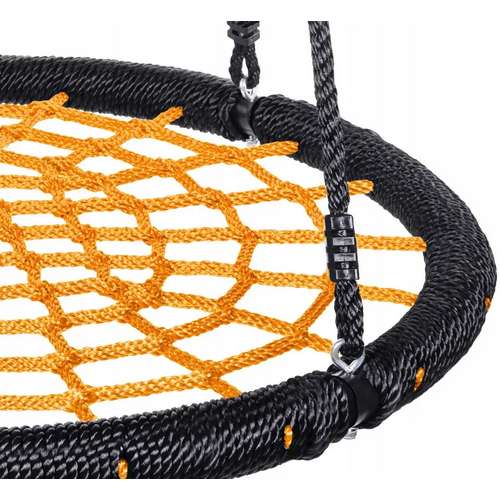 - Міцні, плетені канати, що закінчуються сталевими кільцями — гарантують легкий монтаж і стабільне, безпечне підвішування гойдалки.