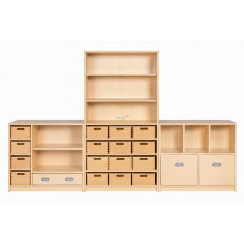 Модульна шафа поєднує місткі фанерні ящики та відкриті полиці для зручного зберігання навчальних матеріалів, іграшок і книжок. Ідеальний варіант для класів НУШ, дитсадків і ресурсних кімнат.Характеристики: