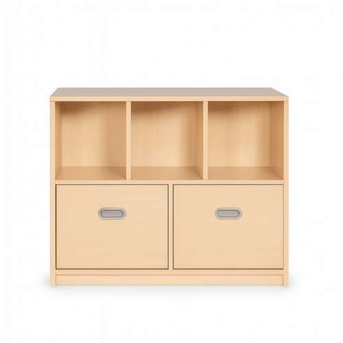 Компактний модуль для впорядкованого зберігання книжок, посібників та дидактики. Верх — 3 відкриті відділення для щоденного доступу; низ — 2 секції за розпашними дверцятами для прихованого зберігання.