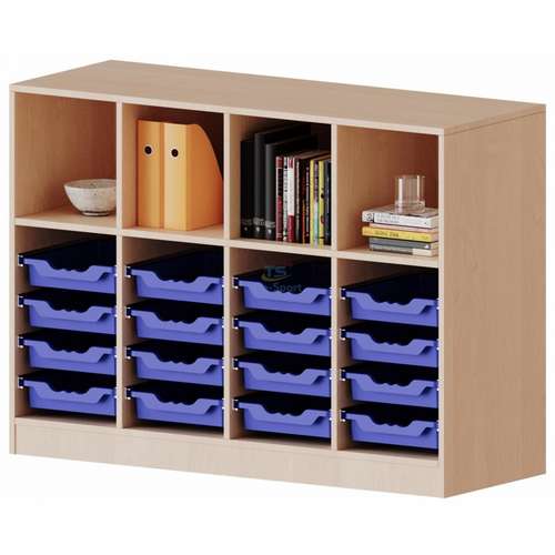 Функціональний стелаж з відкритими полицями та 16 плоскими контейнерами для систематизації книг, посібників, канцелярії та ігор. Оптимальне рішення для організації простору у навчальних закладах та дитячих кімнатах.