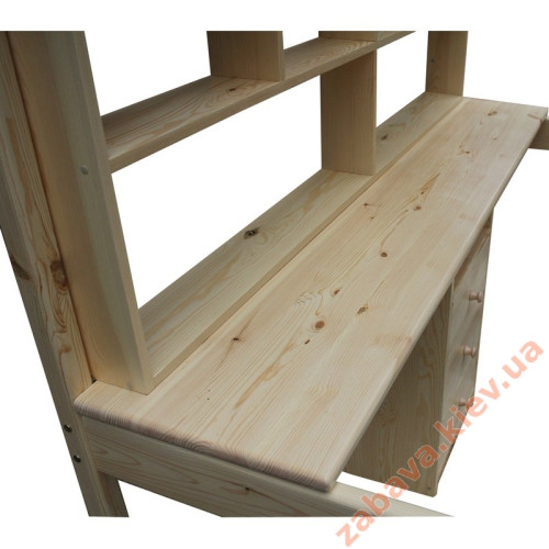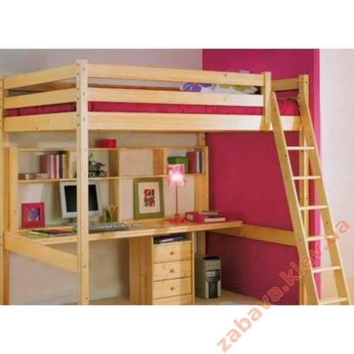 Ліжко горище з робочою зоною - це дитячий меблевий комплекс, який має два рівні: верхній та нижній. На верхньому рівні розташоване спальне місце для дитини, а знизу – робоче місце. У комплектацію ліжка входить: ліжко-горище, робоча поверхня столу, стелаж, комод з висувними ящиками.