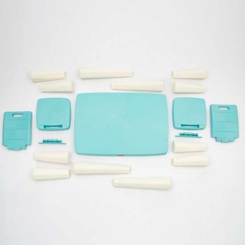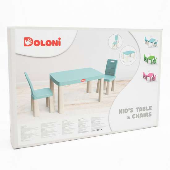 Комплект 04680/7 бірюзового кольору складається з дитячого столу з пластику, а також з двох дитячих стільців, так само з пластика. Дитячі стільчики, так само можна використовувати як табурет. У даній моделі повністю знімається спинка і замість спинки, можна поставити заглушку, яка є в комплекті.Розміри столу: