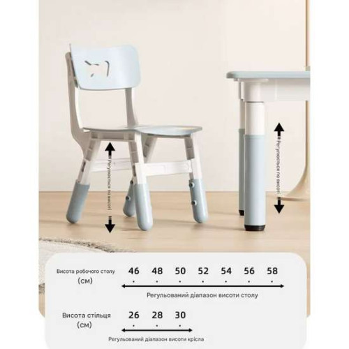Висота столика регулюється від 46 см до 58 см, що дозволяє легко підлаштувати його під зріст вашої дитини. Це забезпечує комфорт та правильну осанку під час навчання та гри, незалежно від віку малюка.