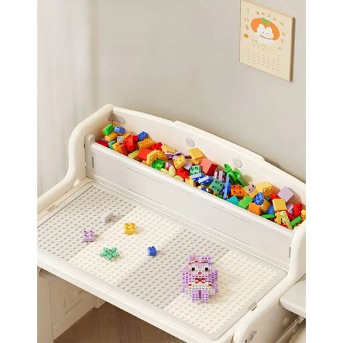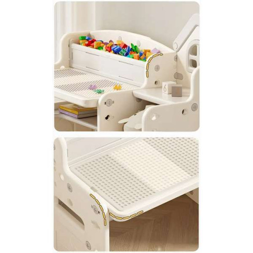 З іншого боку дитячого столика є поверхня зі спеціальними пазами, де легко і надійно встановлюються деталі конструктора. Для яких, щоб вони завжди були на своєму місці, також існує спеціальна скринька.