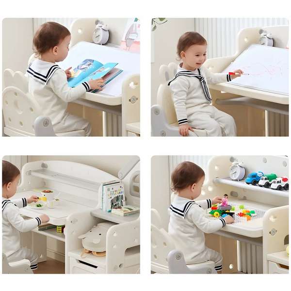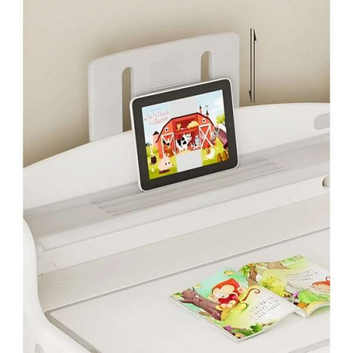 Насамперед, йдеться про унікальний та багатофункціональний стіл. Який має не просто стільницю, за якою дитина може вчитися читати і писати, а й мольберт, що встановлюється на неї. Великий, та регульований за рівнем нахилу. Тепер у вашого чада відпаде необхідність розмальовувати стіни. Для цього йому знадобляться лише водяні маркери, які йдуть у комплекті і при необхідності легко стираються з мольберту.