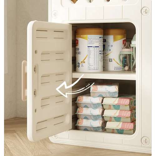 З іншої сторони шафи розташовані відкриті полички, зверху для зручного доступу до найпотрібніших речей, а знизу - з дверцятами, за якими можна приховати менш необхідні речі або іграшки.
