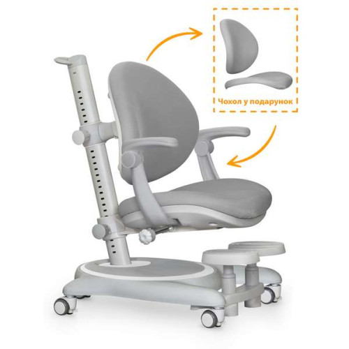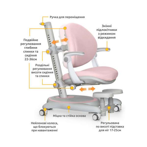 Регульоване по висоті дитяче крісло на коліщатках з підставкою для ніг та підлокітниками.