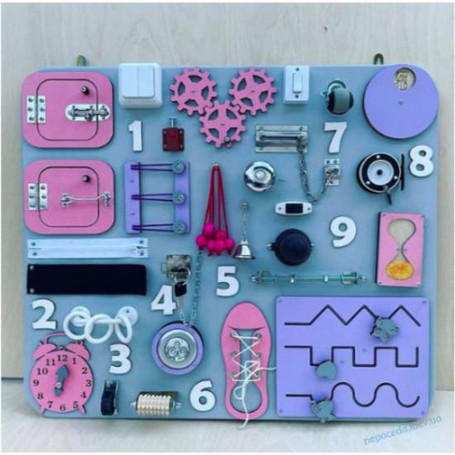 Розвиваючий бізіборд для дітей на основі методики «Монтессорі». Підходить для корекції відхилень у дитячому розвитку.Містить у собі 28-32 елементів, що розвивають.