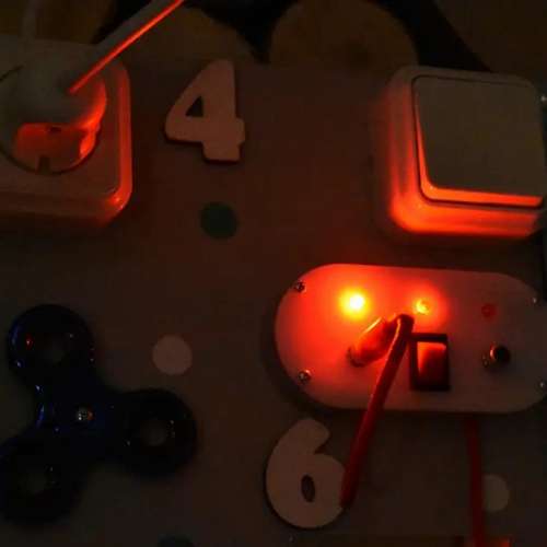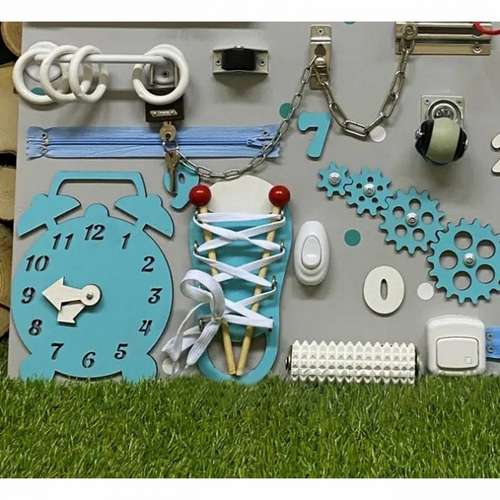 Великий бізіборд Корисні навички - це спеціальна іграшка для раннього розвитку дітей, створена відповідно до методики відомого італійського педагога Марії Монтессорі.На ігрові поля бізібордів прикріплюються всілякі предмети та дрібні елементи, які допоможуть дитині швидше освоїтися в навколишньому світі та навчитися правильно користуватися побутовими предметами: ланцюжки, замочки, муляжі розеток та вимикачів, годинники, шнурки, спіннери, ксилофон, лабіринти. Бізіборд підійде, як малюкам - просто посмикати, повивчати, так і старшим дітям - більш складні замки, вивчення цифр і часу. Цей бізіборд обладнаний ліхтариком, який вмикається від вимикача та світловою панеллю зі штекерами! Дверний дзвінок грає 25 мелодіями!