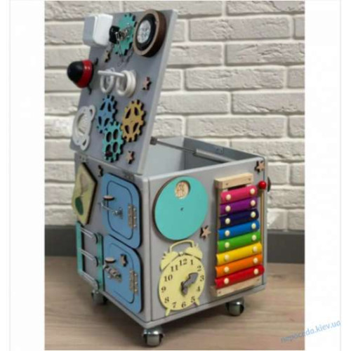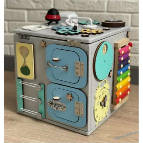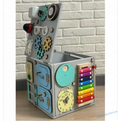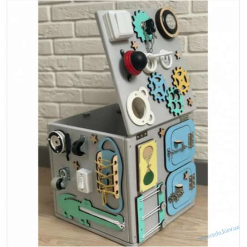 Дитяча іграшка виконана у вигляді куба з кожного боку якого є бізіборд. Цей бізикуб - відмінний «заспокійливий засіб» для маленьких непосид, адже така іграшка надовго захопить малюка, а ви зможете спокійно займатися домашніми справами. Граючи з цією іграшкою, малюк навчиться розпізнавати форми та потренує зорово-моторну координацію. Кожна зі сторін представленого куба дарує маленьким фантазерам широкі можливості для ігор та розвитку. Виріб підходить для дітей віком від 8 місяців до 4 років.Бізіборд оснащений всілякими шестеренками, вимикачами, лабіринтами, годинниками та іншими пристроями, які неодмінно зацікавлять малюка або забезпечать захоплюючу і пізнавальну гру. Завдяки кришці, що відкривається, ви зможете зберігати всередині даного куба невеликі дитячі іграшки.