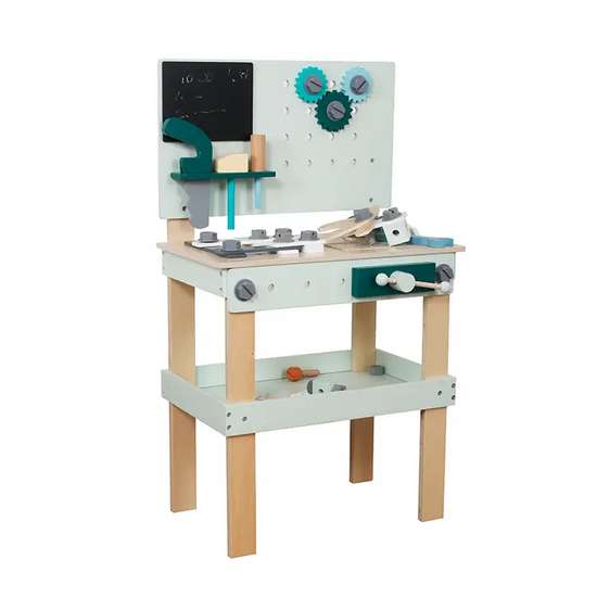Дерев’яний верстак з інструментами – це не просто предмет меблів – це місце, де дитинство змішується з пристрастю до саморобки. Це точно прозвучить як мелодія для вашого малюка! Маленька крейдяна дошка стане додатковою привабливістю і дозволить написати план дій або намалювати проект. Чудова іграшка, яка перенесе вашу дитину у світ дорослих і дозволить відчути себе справжнім майстром.