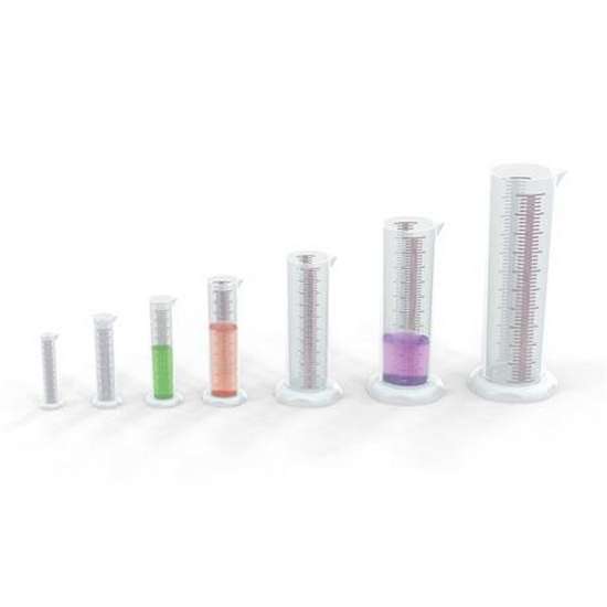 У комплект входить 7 мензурок різної ємності: 10 мл, 25 мл, 50 мл, 100 мл, 250 мл, 500 мл та 1000 мл.