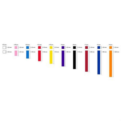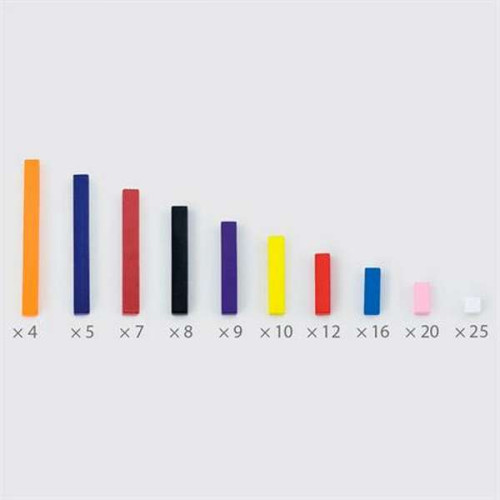 У наборі 116 паличок від 1 до 10 см. Кожна паличка в наборі – це число, виражене кольором і величиною. Елементи однакової довжини пофарбовані в один колір і представляють конкретне число. Також вони діляться на групи за кратністю.