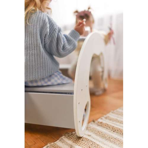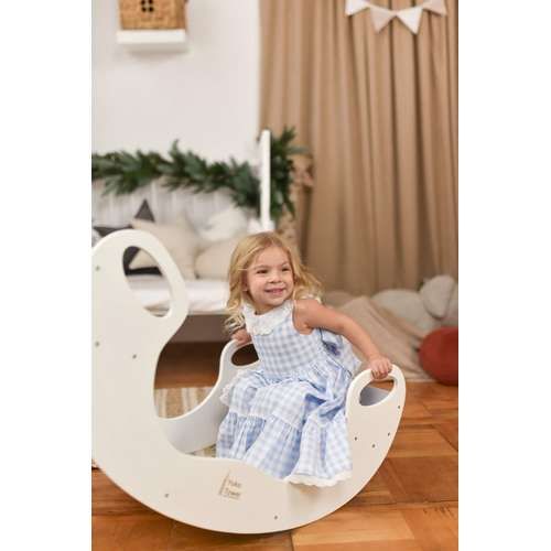 Гойдалка-стіл є одним із багатофункціональних предметів меблів, що ідеально відповідає філософії Монтессорі. Вона слугує як місцем для навчання і творчості, так і затишним куточком для ігор або відпочинку.