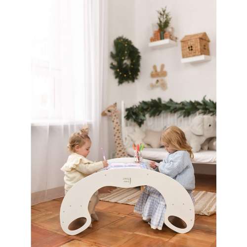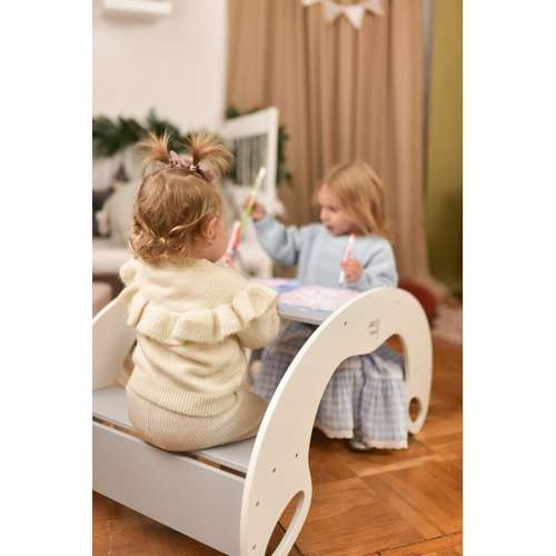 Пропонуємо нашу гойдалку 2в1 і стіл Монтессорі – ідеальний вибір для гри двох дітей! Цей універсальний елемент дитячих меблів забезпечує безмежні години розваг і навчання в одному.
