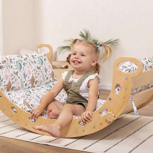 Основна особливість балансувальної дошки для дитячої кімнати – вона може легко та швидко перетворюватись в гойдалку для двох дітей зі зручними сидіннями або знову трансформуватись у звичайний балансир. Секрет в регульованих сидіннях: з допомогою надійних бічних кріплень, їх можна виставити в бажаному положенні, чи прибрати. Бічні вирізи на основі дерев’яного балансира допомагають також закріпити тут подушку, щоб ще більше урізноманітнити ігрові сценарії. В комбінації із подушкою на зав’язках відповідного розміру балансир-гойдалка Монтессорі стане затишним кріслом-качалкою.