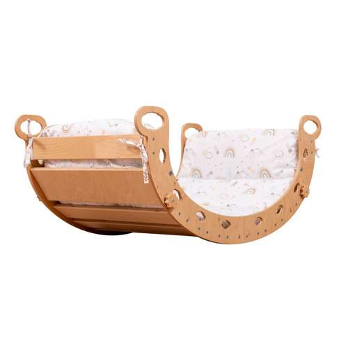 Балансир можна використовувати як класичну арку для лазіння по ній зверху чи повзання малят попід нею. В цьому положенні виріб також може стати для дитини казковим містком чи вежею лицаря. Додайте до балансира подушку – і це вже крісло-качалка. Поверніть бокові регулятори, висунувши сидіння – і тут одночасно зможе гратись двоє дітей. Тож цей Монтессорі ігровий тренажер пропонує набагато більше опцій, ніж звичайний балансир. Варіантів для гри безліч, і окрім зазначених, можна придумувати власні ігри, і поки малюк захоплено та сфокусовано досліджує цю іграшку й робить чудові відкриття, батьки встигнуть випити свою каву ще гарячою.