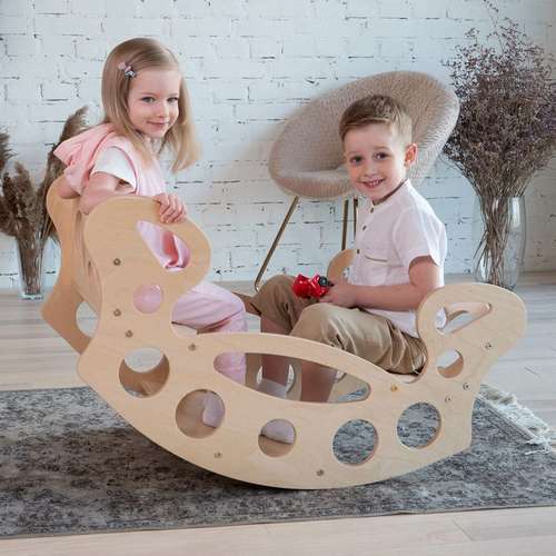 В форматі гойдалки Монтессорі балансувальна дошка дозволяє діткам весело розважатись безпечному середовищі. Стільниця парти тут виконує роль підставки для ніг та забезпечує комфорт і зручність під час гри. Такий балансир – це водночас весела розвага, корисний інструмент для тренування вестибулярного апарату, що допомагає дітям опановувати своє тіло в просторі. Заколисувальні рухи також сприяють зменшенню рівня тривоги та заспокоюють малят.