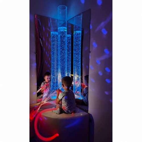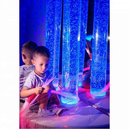 Бульбашкова кутова колона з пучком фіброоптики використовується в рамках терапії сенсорної інтеграції, зорової і тактильної стимуляції, а також снузелен терапії. Дитина одночасно може спостерігати за бульбашками, що рухаються в колоні і брати в руки пучок фіброоптичних волокон, крутити, обмотувати навколо рук і тіла, таким чином покращуючи психоемоційний стан. Рекомендується для дітей, яким необхідний розвиток сенсорної сфери - це візуально стимулююча захоплююча та розвиваюча гра зі світлом. Перебираючи волокна, що світяться в руках і спостерігаючи за бульбашками у воді колони, діти занурюються в умиротворений стан і одночасно розвивають тактильне і зорове сприйняття, вчаться концентрувати увагу, стимулюють уяву. Тактильний та світловий контакт з виробом має релаксаційний вплив, забезпечуючи відчуття спокою, безпеки та розслаблення.