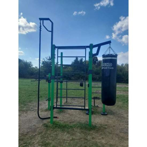 Конструкція спортивного комплексу виготовлена з міцного металу, розрахованого на інтенсивні навантаження та тривалий термін експлуатації. Вуличний спортивний комплекс, залежно від моделі та комплектації, виконує функції універсального тренажера та дозволяє ефективно тренувати м’язи преса, рук, грудей і спини.