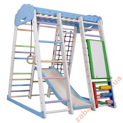 Вас приємно здивує спортивний комплекс для дому Спортивний комплекс для дому «Акварелька Sky Plus 7» ціна, а також висока якість даного товару. Споруда відрізняється компактними розмірами, що дозволяє встановити її в невеликій квартирі. Його висота складає всього 150 см, а вага – 39 кг. Виріб призначений для справжніх юних спортсменів: він складається зі шведської стінки, рукохода, сітки гладіаторської, гірки, а також з гімнастичних кілець, мольберта для малювання і кольорових рахунок. За допомогою таких спортивних елементів дитина зможе отримувати повноцінне фізичне навантаження, тренувати всі групи м'язів, а найголовніше – все це відбуватиметься в ігровій формі, що дуже важливо для малюків.