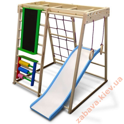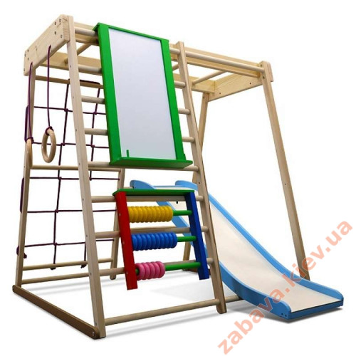 Дитячий спортивний комплекс для будинку з хвилястою гіркою, мольбертом і рахівницею в натуральному кольорі для раннього розвитку.