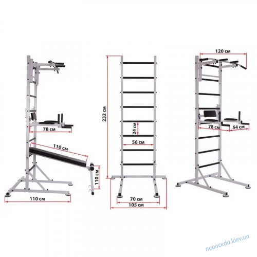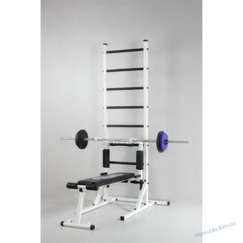 Шведські сходи мають 8 металевих перекладин. На цих перекладинах знаходиться пластикове покриття, в наборі комплектом ви отримуєте знімний турнік і знімні бруси, які можуть використовуватися для вправ на прокачування преса, а в перевернутому положенні служать підставкою під штангу. Також стійка має знімну лаву, яку можна встановлювати в похилому та горизонтальному положенні.