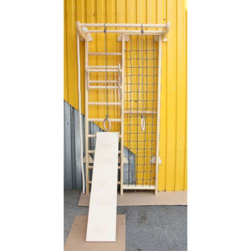 Комбінована шведська стінка з дерева. Шведська стінка, гладіаторська сітка, кільця та канат, навісний турнік, дошка. Навантаження 100 кг. Висота 225 см.