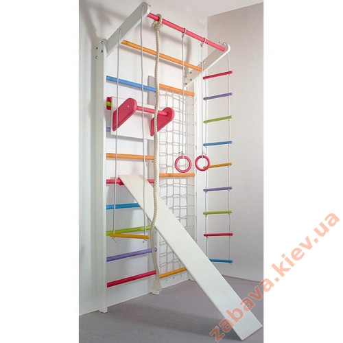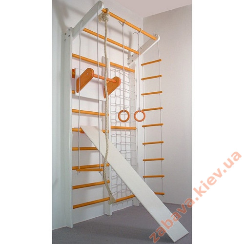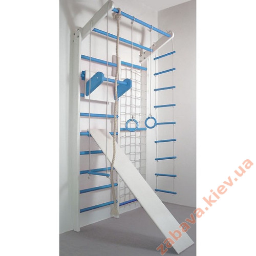 Перевагою Комбі є наявність у його складі, крім шведської стінки, ще й сітки гладіаторської. Ширина всього комплексу 120 см, з них 60 см сітка та 60 см сходи. Допустима вага 120 кг, тобто. разом із дитиною можуть займатися і батьки.