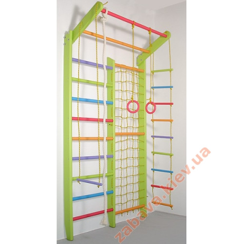 Базова комплектація: комбі (шведська стінка з сіткою), мотузковий набір, дошка, турничок та гімнастичний мат.