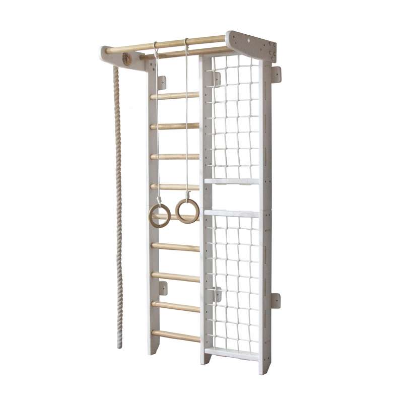 Спортивний куточок Комбік, з канатом і кільцями гімнастичними висотою 225 см. Колір - комбінація білого кольору з лаком.Матеріал каркасу - сосна, перекладини - ясен
