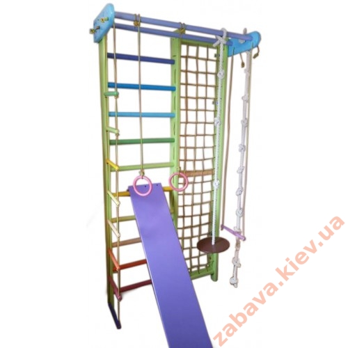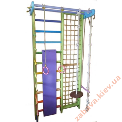 Спортивний куточок Комбік+ Веселка є комбінованою конструкцією зі шведської стінки та гладіаторської сітки для лазання, об'єднаних у загальному каркасі зі стаціонарним турником.