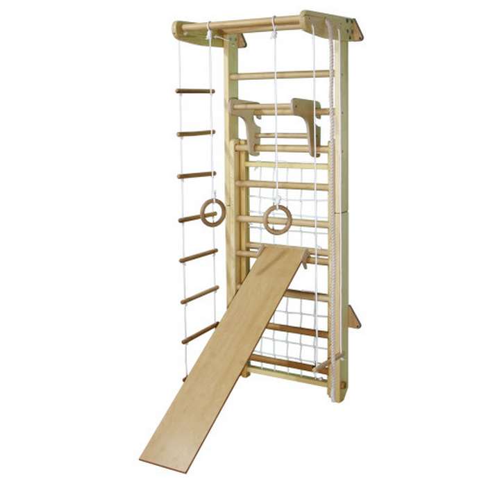 Шведська стінка - трансформер з мотузковим набором, дитячим навісним турничком, дошкою для преса та спини. Спортивний куточок-трансформер використовується в двох положеннях: у складеному вигляді він являє собою стандартну шведську стінку, а нижня частина, що розкладається, перетворює його в комплекс з рукоходом і гладіаторською сіткою для лазіння. Процес складання та розбирання гранично простий і займає не більше 2 хв. Цей спортивний куточок є оптимальним рішенням, як найбільш функціональний та компактний.