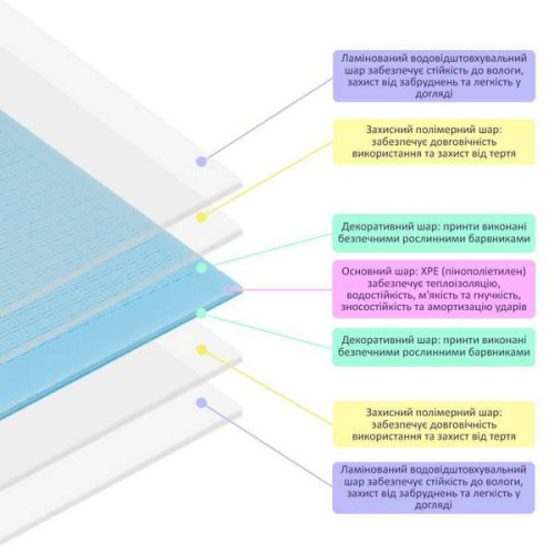 Основний матеріал килимка – спінений поліуретан (ХРЕ). Цей матеріал широко застосовується, він має термоізоляційний ефект, тобто не пропускає холод, а також не викликає алергію. Верхнє покриття килимка — харчова плівка, яка робить килимок вологостійким і захищає малюнок від зносу.